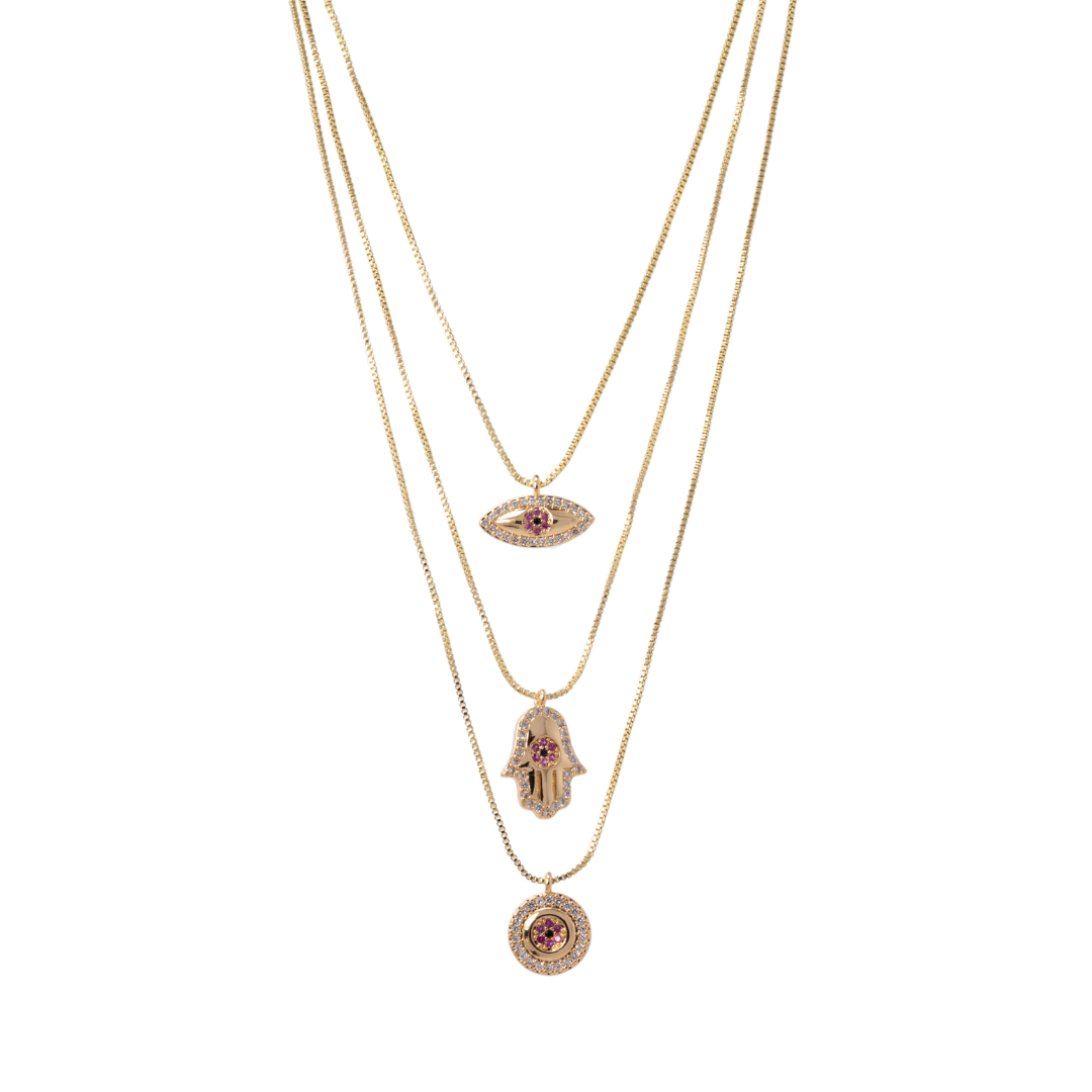 cadenas con dijes de ojito en diferentes formas. Chapa de oro.