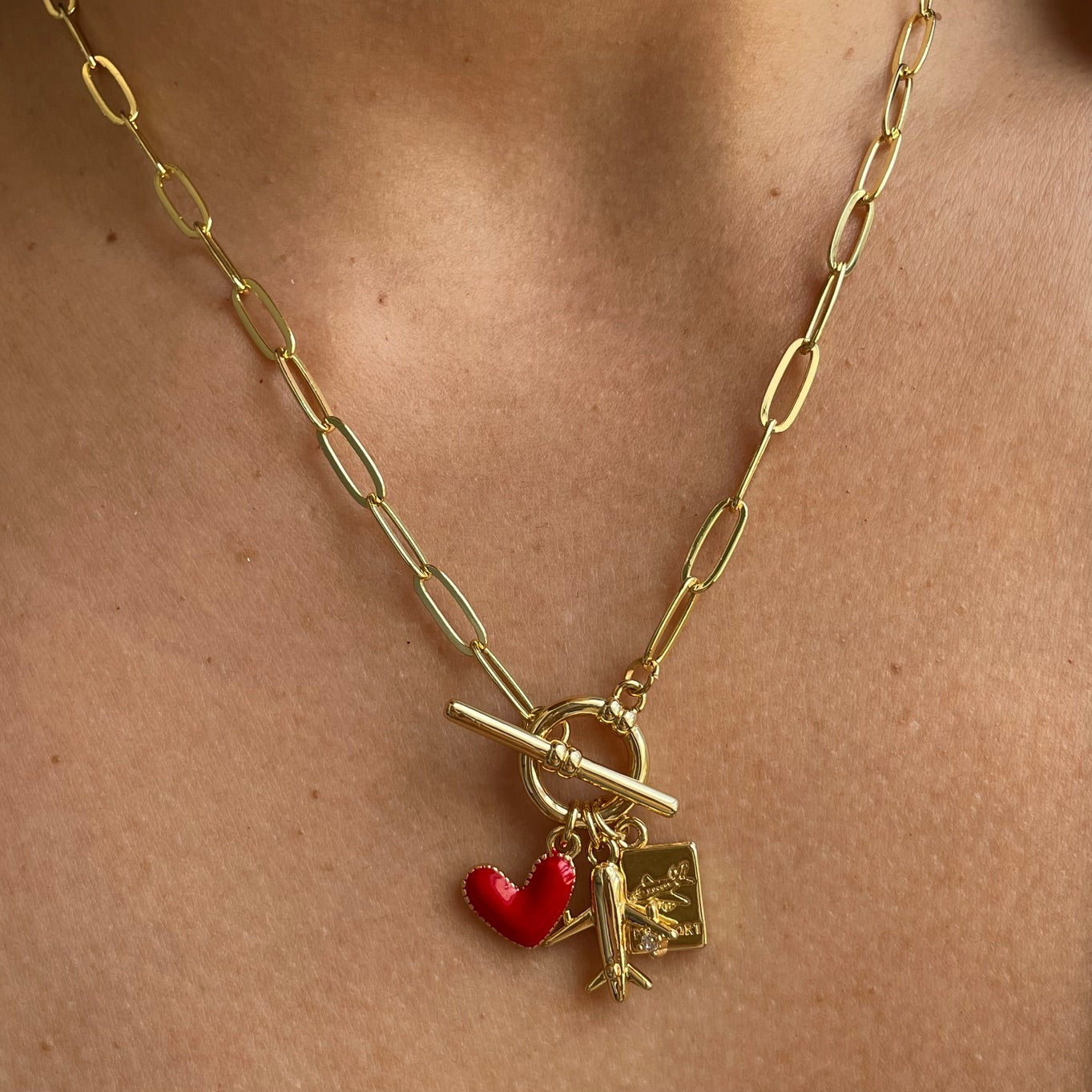 Collas con broche T y dijes alusivos al amor que tenemos de viajar. Chapa de oro.