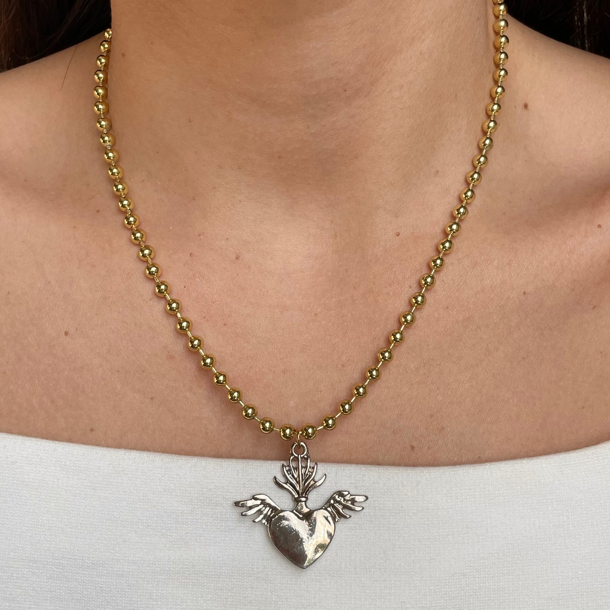 Colar con dije plateado, corazón con alas.
