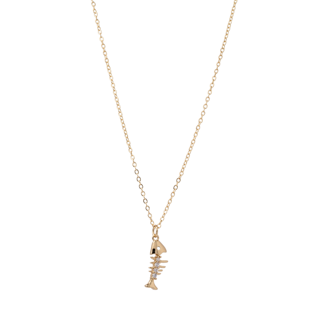 Collar con dije de esqueleto de pez y pequeños detalles de zirconias. Chapa de oro.