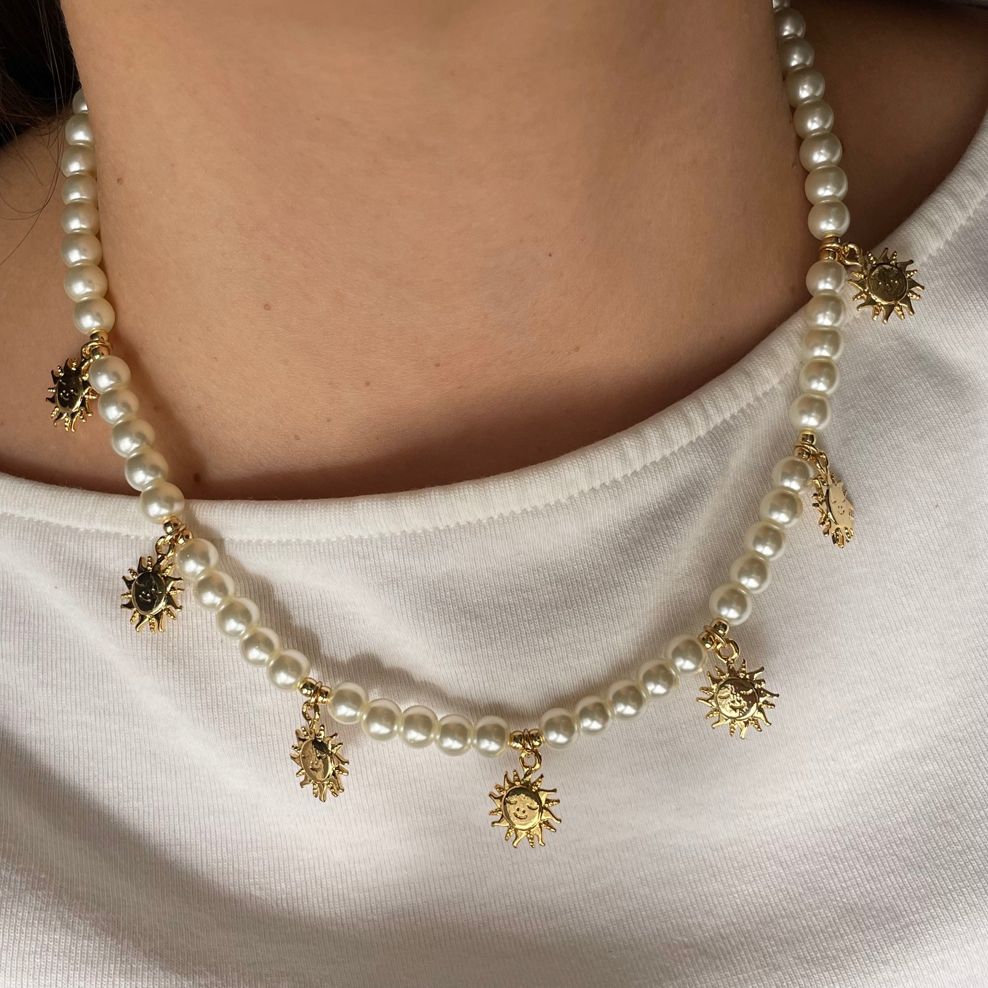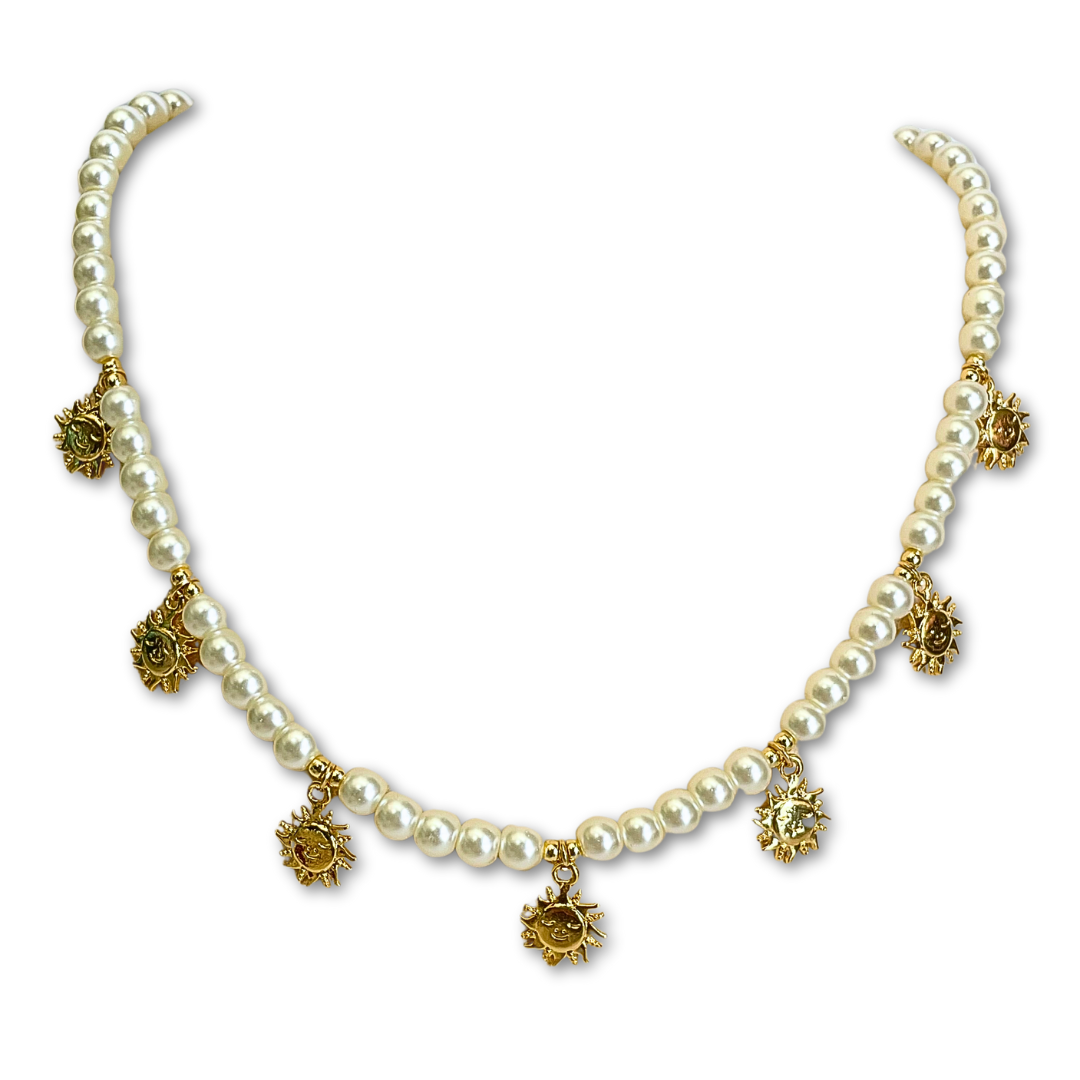 Collar de perlas de cristal con dijes de Sol. Chapa de oro.