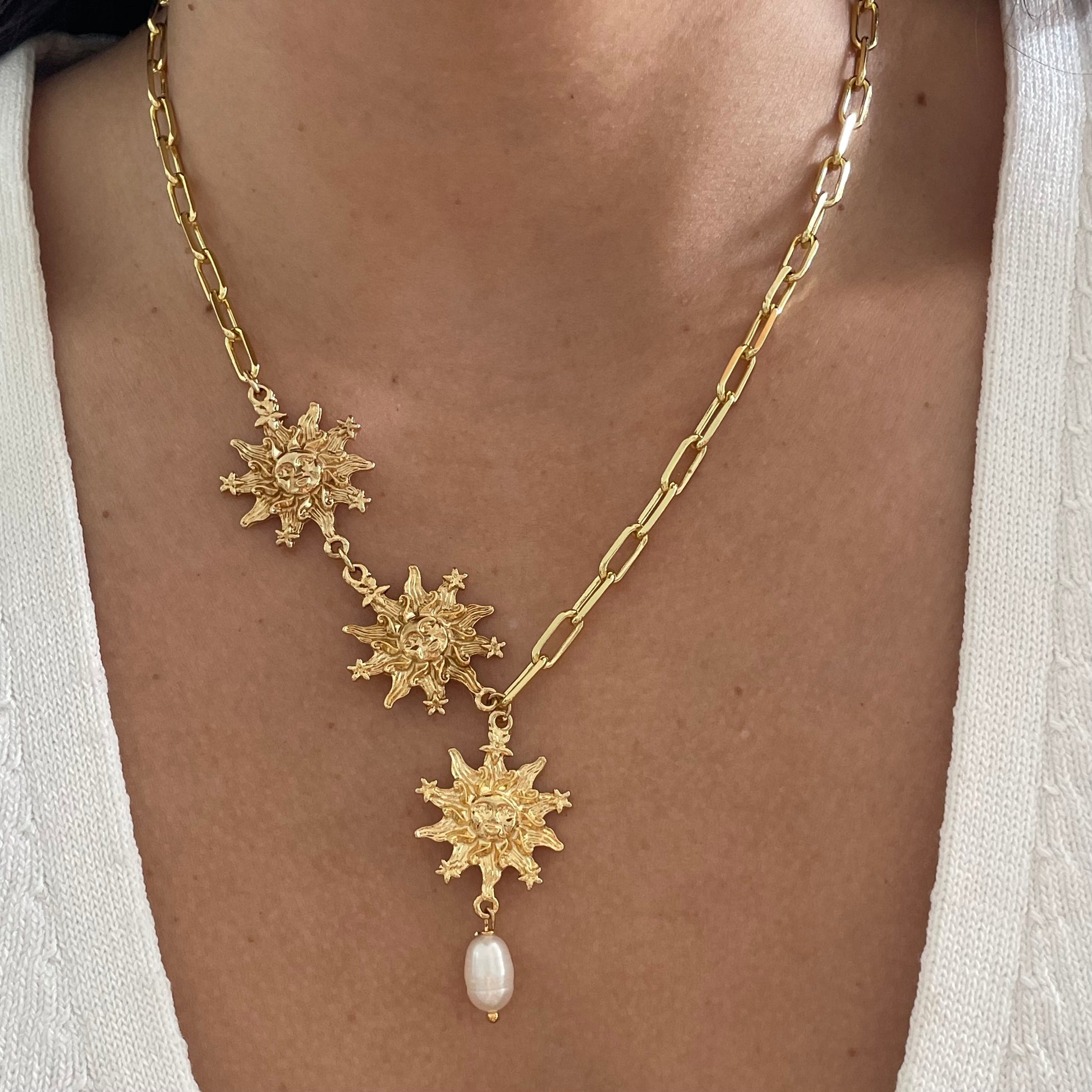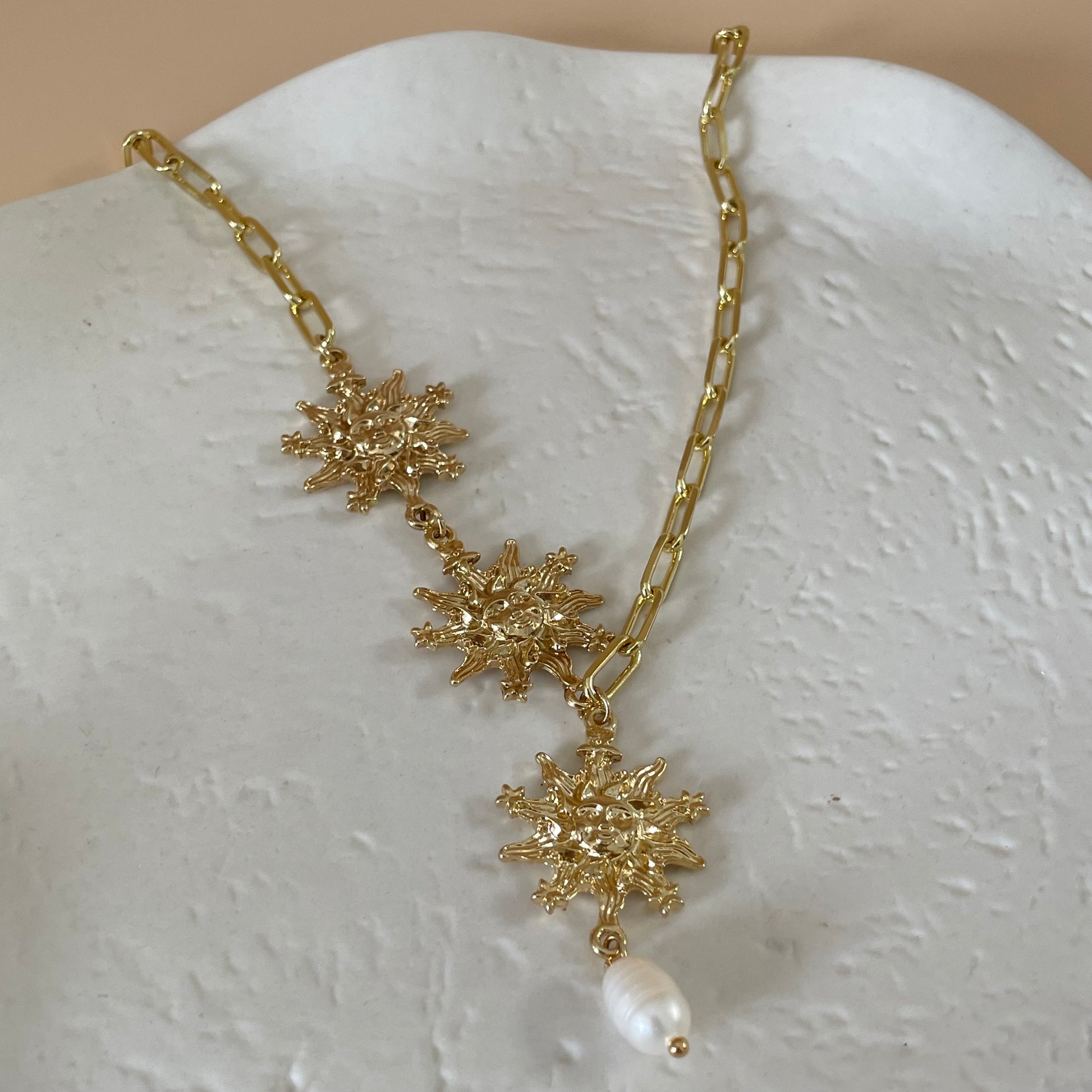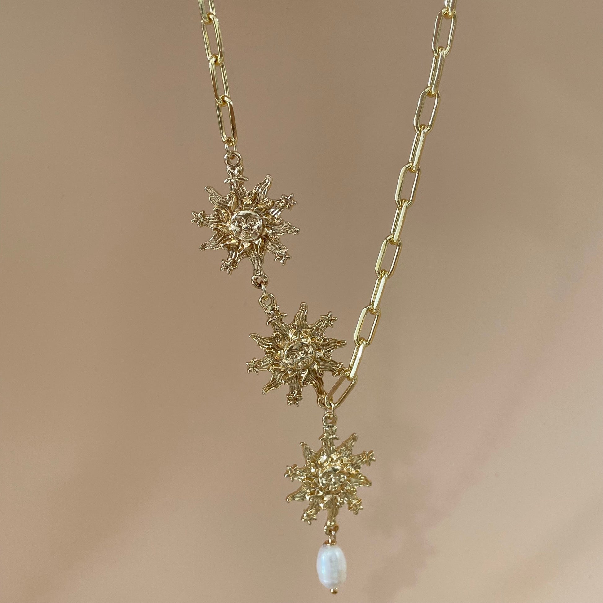 Collar con detalle de res dijes de sol y perla natural. Chapa de oro.