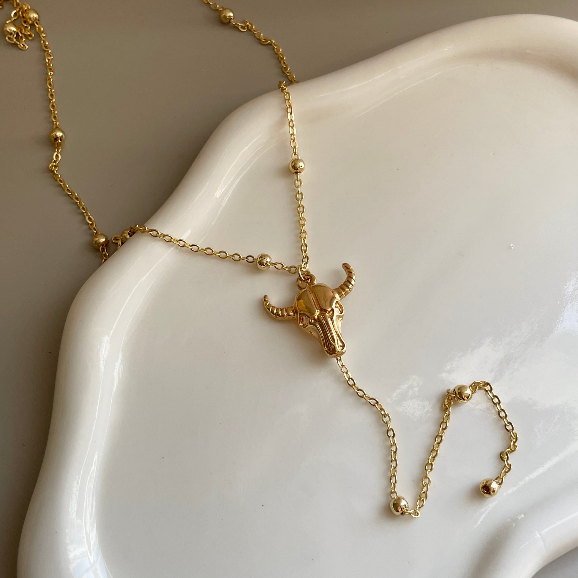 Collar estilo corbatín de cadena con dije de cabeza de toro.