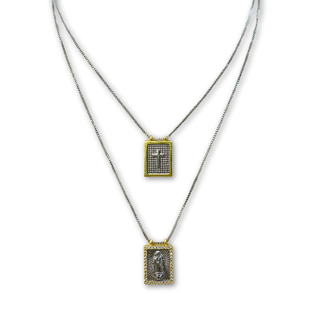 Escapulario bicolor con imagen de la Virgen de Guadalupe.